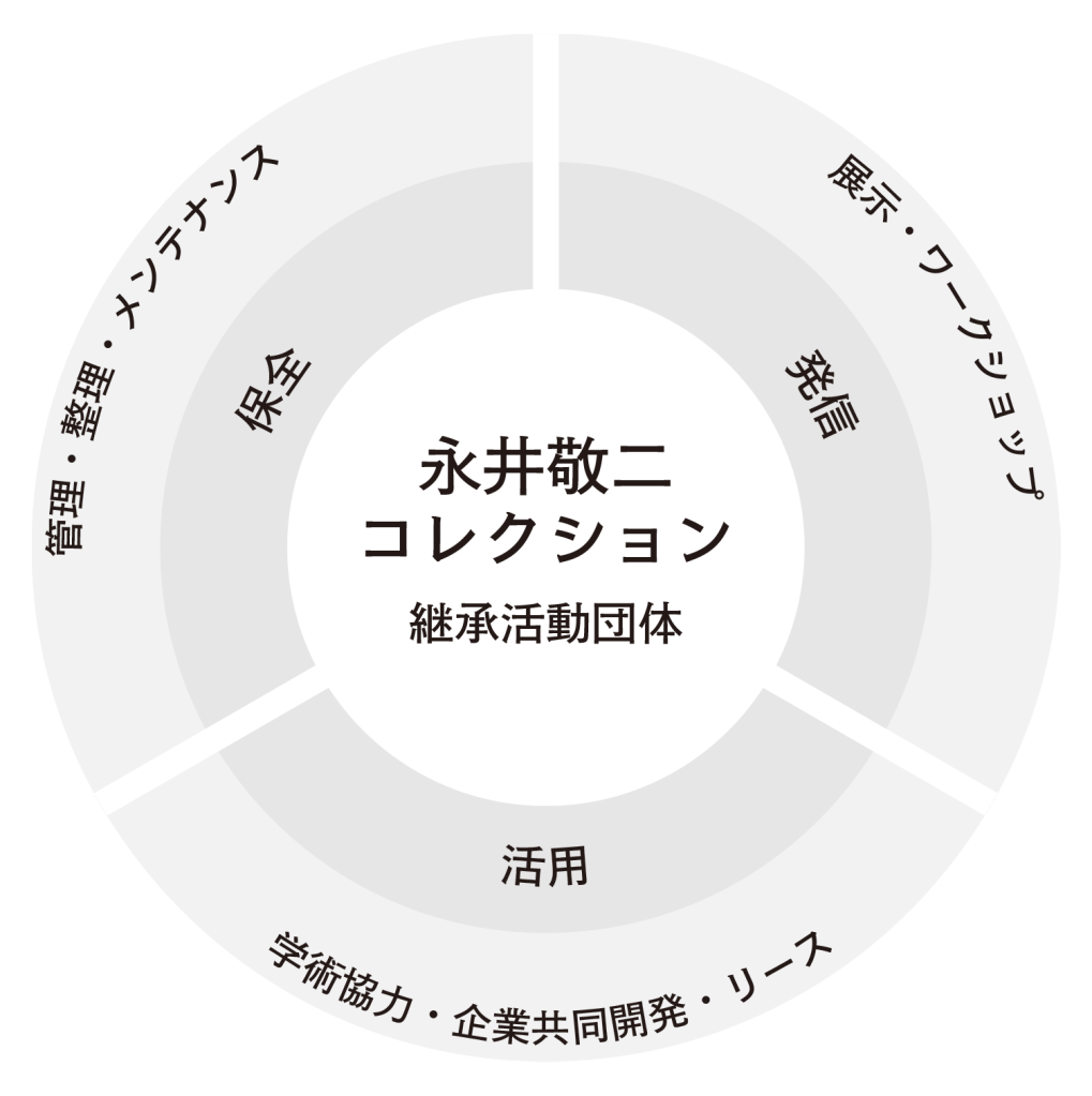 私たちのミッションは、永井敬二コレクションを〈デザインの社会資産〉として未来へ引き継ぐことです。 その実現のために、コレクションの保全・発信・運用活動に取り組み、継承のための基盤づくりを進めています。 そして、当コレクションが次世代のデザイン文化、産業、教育の発展に寄与することを目指しています。